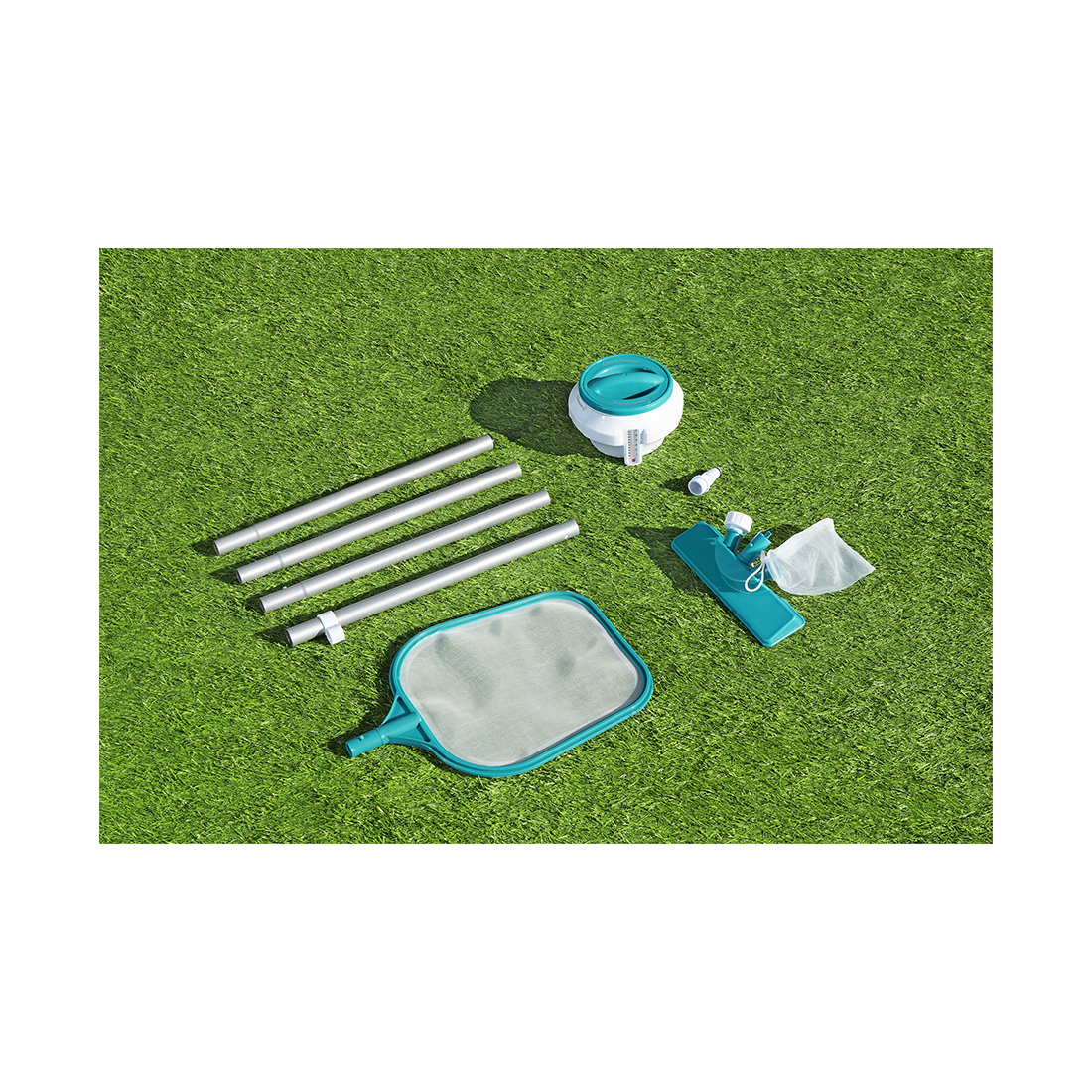 Поддерживайте наземный бассейн в первозданном состоянии с комплектом принадлежностей для бассейна Bestway® AquaClear™. Это комплект содержит все необходимые инструменты для ухода за бассейном в течение всего сезона радости и веселья – для отслеживания и регулирования уровня хлора, для всасывания и удаления мусора, для проверки температуры воды в бассейне и даже для ремонта лайнера при прокалывании!