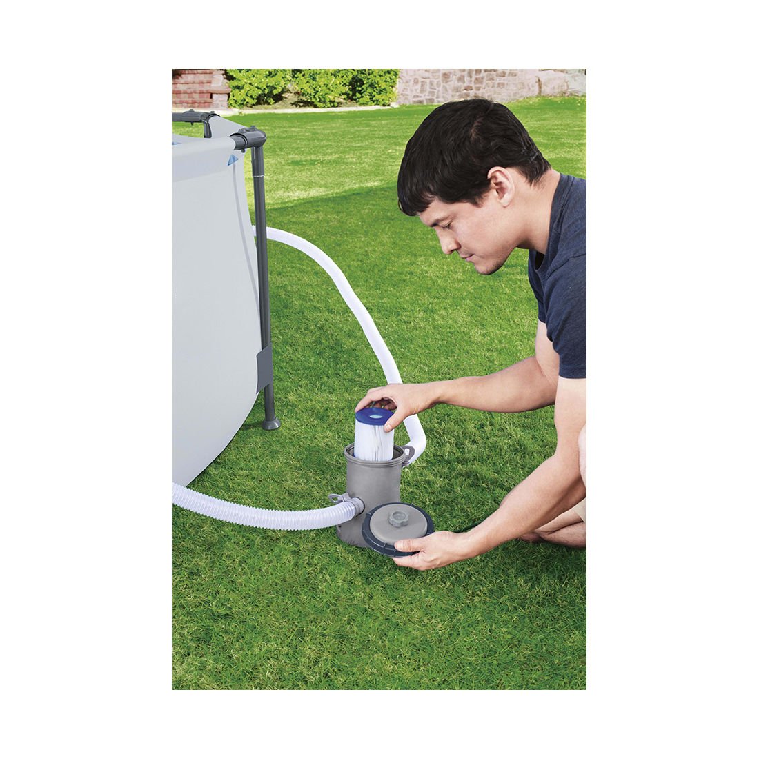 вода поступает по шлангу внутрь фильтрующего насоса, проходит через фильтрующий элемент, оставляя грязь на нем, и поступает обратно в бассейн;