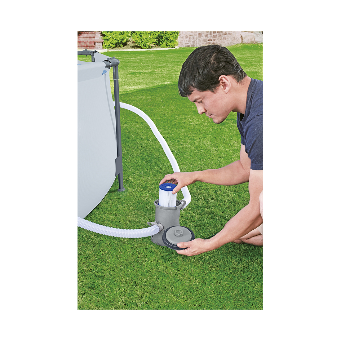 вода поступает по шлангу внутрь фильтрующего насоса, проходит через фильтрующий элемент, оставляя грязь на нем, и поступает обратно в бассейн;