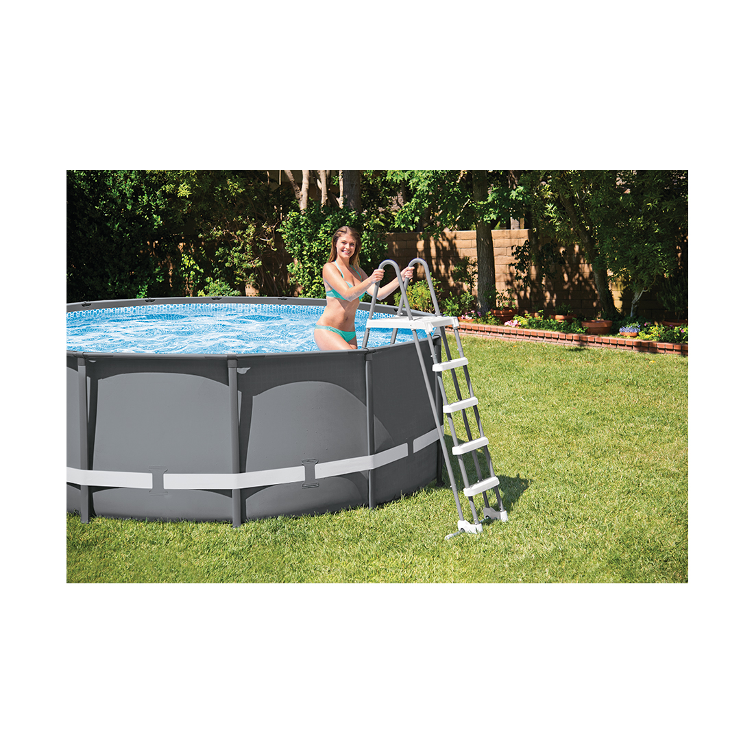 Лестница служит для комфортного использования бассейна. Ступени расположены по обеим сторонам, не крепится к самому бассейну. Устойчивая конструкция - с одной стороны лестничный марш упирается в землю, с другой в дно бассейна. Легко переставить в удобное место или совсем убрать при консервации бассейна на зиму.