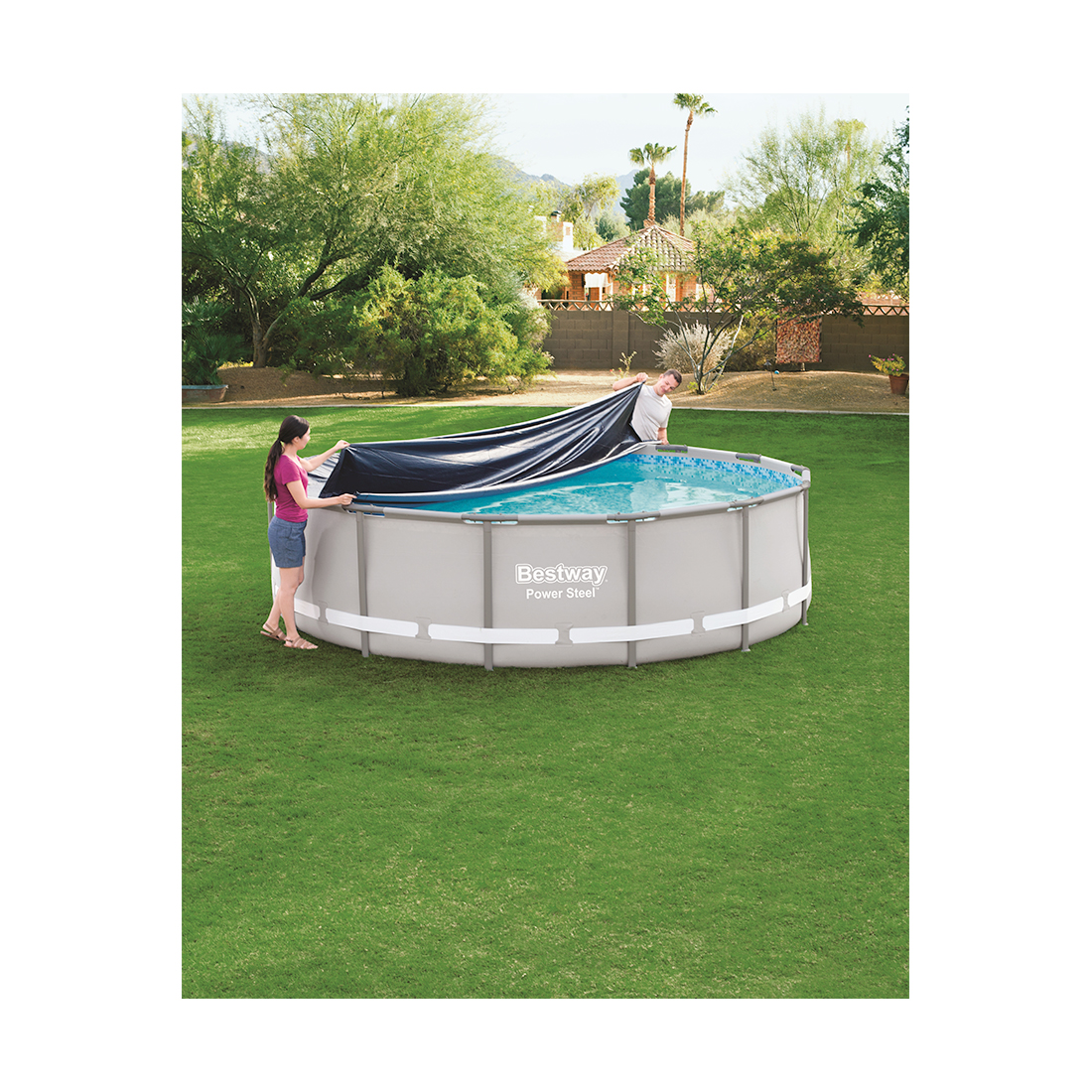 Тент предохраняет бассейн от попадания в него пыли, грязи, листвы, сохраняет воду чистой. Рекомендуется накрывать бассейн тентом на все время, пока бассейн не используется.