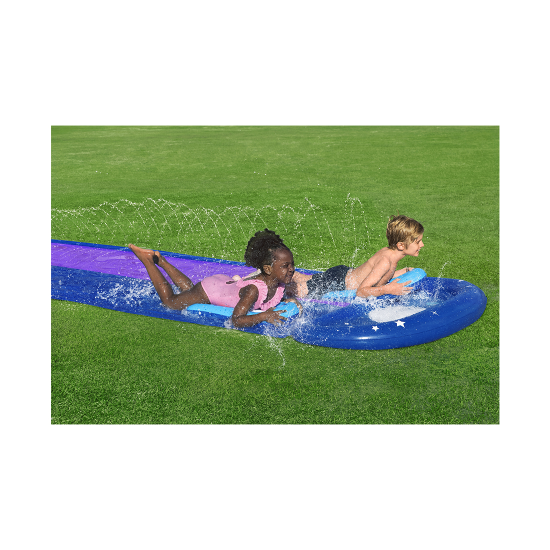 Откройте для себя лето, полное веселья, с двойной водной горкой H2OGO!® Lunar Launch™! Горка имеет красочный космический дизайн и 2 параллельные дорожки, которые идеально подходят для групповых развлечений. Дети могут воспользоваться двумя надувными досками для серфинга, чтобы промчаться с друзьями с Земли на Луну. Встроенные разбрызгиватели SplashBoost™ специально разработаны для более эффективного покрытия и обеспечивают гладкость обеих дорожек; дети могут скользить сколько душе угодно к большому бассейну на финише. Установка проста, поэтому вы можете потратить больше времени на создание летних воспоминаний. Просто подсоедините горку к садовому шлангу и можете начинать скользить по горке H2OGO! Lunar Launch!