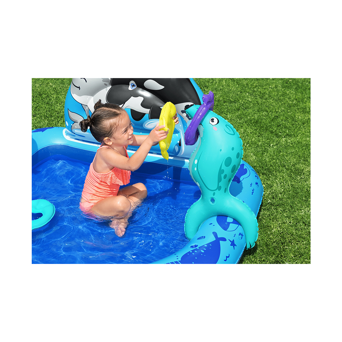 Приготовьтесь к «прохладному» лету веселья с игровым центром Bestway® Polar Pals™! В игровом центре Polar Pals с дружелюбными арктическими животными есть большая игровая площадка с бассейном, в которой есть игра с бросанием надувных колец с 2 возможными мишенями. Дети в возрасте от 2 лет и старше могут целиться в рог нарвала или бросать кольца в форме рыбок на надувного тюленя. Чтобы увеличить сложность броска кольца, тюленя можно перемещать по игровому центру, чтобы создать большее расстояние до цели. Также в комплект входит надувной приятель-пингвин с 2 игрушечными рыбками из пеноматериала, с которыми дети могут плескаться или кормить ими пингвина. Игровой центр Polar Pals идеально подойдет для вашего переднего или заднего двора и может быть легко установлен; для этого его нужно просто подсоединить к ближайшему садовому шлангу. Убрать бассейн можно так же легко благодаря простому в использовании сливному клапану. Затем, когда игровой день закончится, бассейн можно сложить и хранить до следующего раза в течение многих сезонов. Исследуйте все развлечения, которые может предложить Арктика, с игровым центром Bestway Polar Pals.
