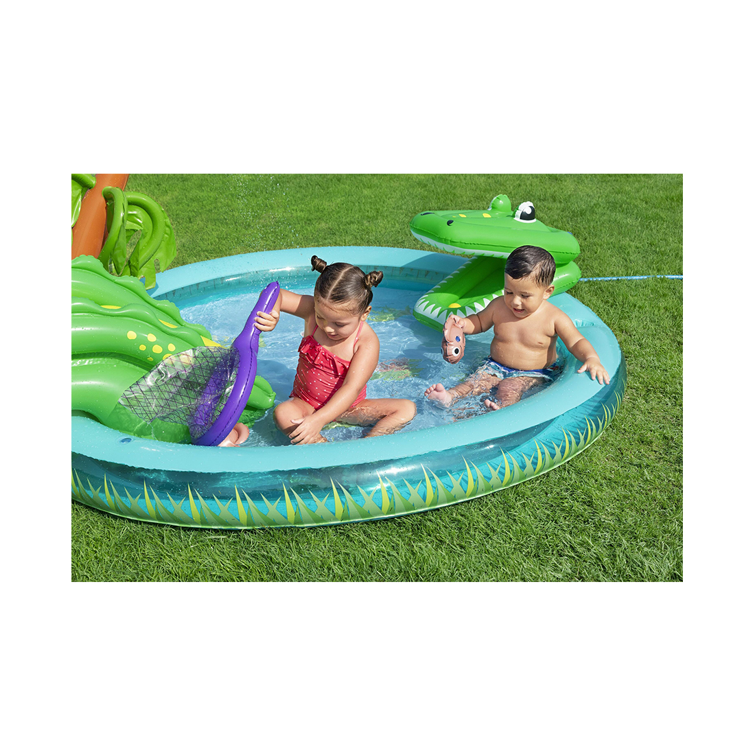 Приготовьтесь отлично провести время в игровом центре Bestway® Crocodile Cove™! Дети в возрасте от 2 лет будут веселиться и плескаться в этом игровом центре, оформленном в стиле крокодила (не волнуйтесь, этот крокодил не кусается!). Они могут бросать входящие в комплект 3 игровых мячика в рот крокодила или скользить вниз по хвосту крокодила в бассейн на мягкий посадочный коврик. Когда дети захотят половить рыбу, они смогут взять съемную рыболовную сеть и начать вылавливать 2 рыбки Puffy Pal™. Прикрепите садовый шланг, и ива будет разбрызгивать воду на детей для дополнительного удовольствия и охлаждения, когда они будут играть на солнце. Игровой центр также имеет простой в использовании сливной клапан для выпуска воды из бассейна, поэтому его можно легко демонтировать и поместить на хранение для использования в будущем. Для идеального лета, полного веселья, не ищите ничего, кроме игрового центра Bestway Crocodile Cove!