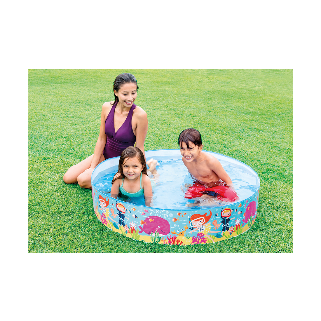 Детский бассейн с веселым рисунком, он легок в установке и транспортировке. Этот бассейн можно смело рекомендовать, если у вас на участке есть домашние животные. Стенки сделаны из плотного материла (они не надуваются). Конструкция водораспорная. Если беспокоитесь о долговечности бассейна - это ваш выбор.