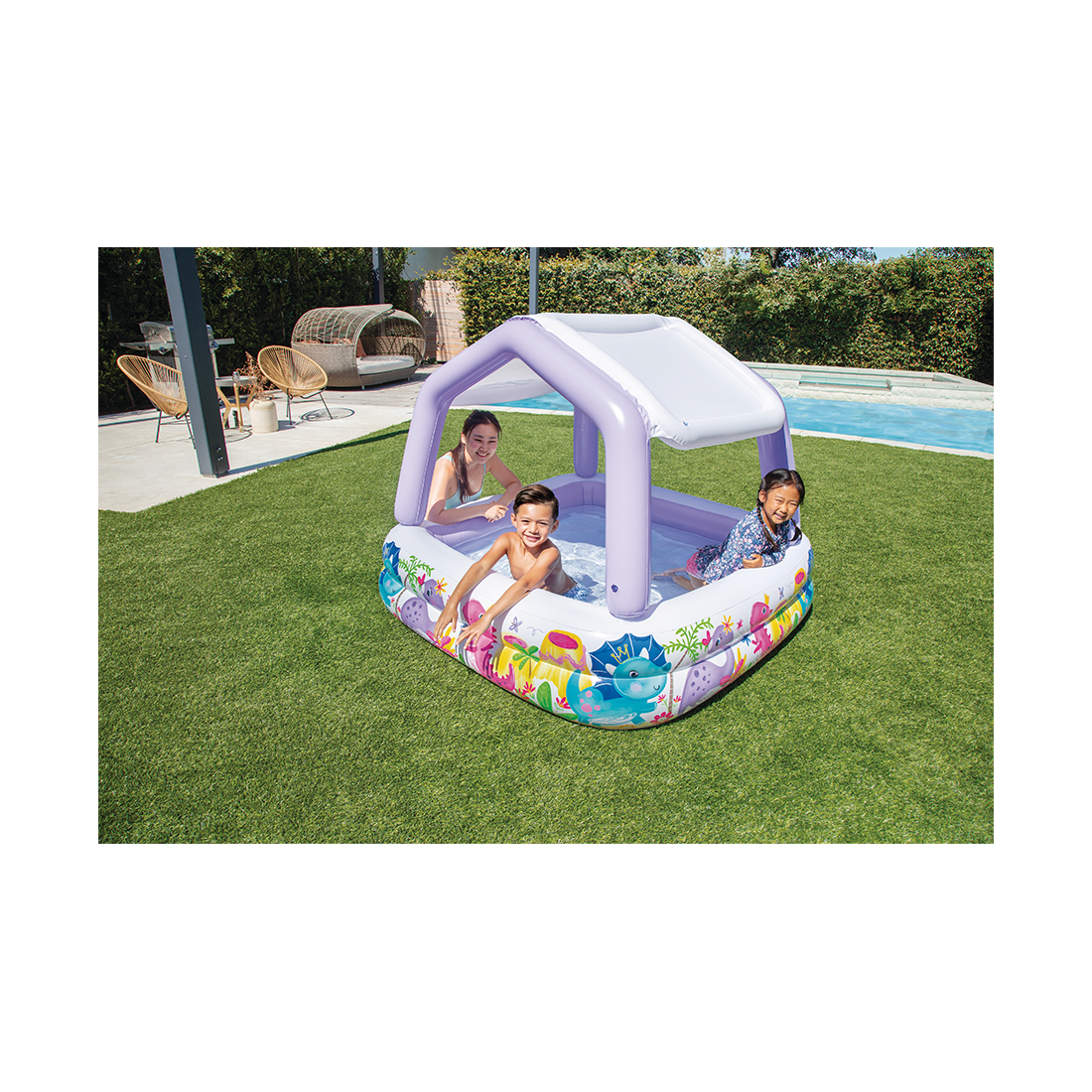 Детский надувной бассейн Sun Shade Intex 57470 - отличный надувной бассейн, который предназначен для купания и веселых игр в воде под открытым небом. Данная модель оборудована специальным съемным навесом, который надежно защищает от воздействия прямых солнечных лучей. Бассейн можно очень легко и быстро надуть и использовать без применения каких-либо специальных средств. Очень удобен, можно брать с собой в дорогу. Изготовлен из прочных и высококачественных материалов, что гарантирует долгий срок службы.