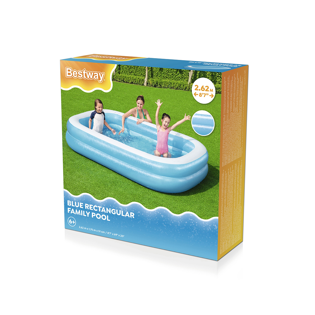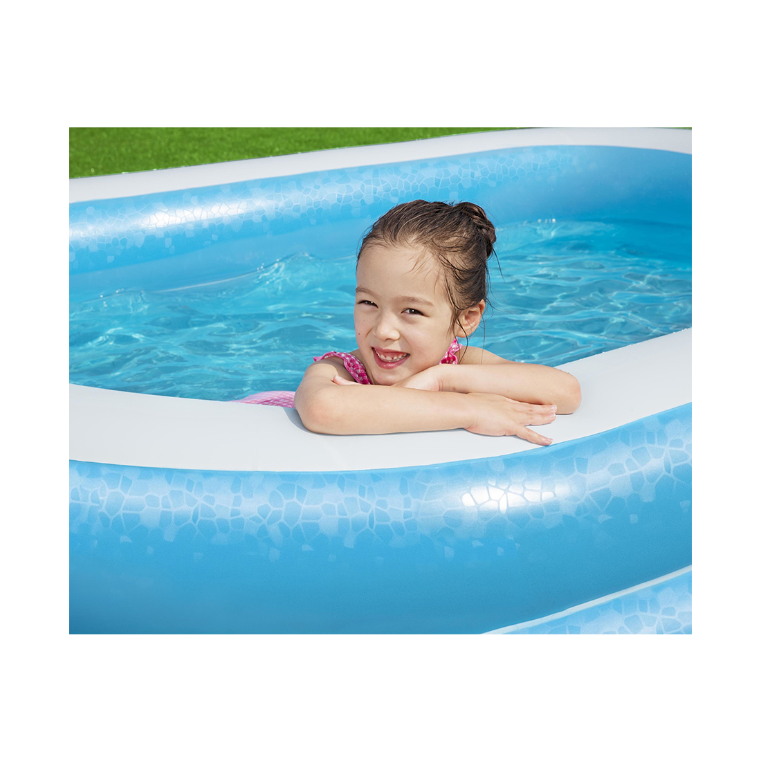 Прямоугольный семейный надувной бассейн Bestway для взрослых и детей от 6 лет. Изготовлен из высококачественного винила, устойчивый, надежный и безопасный. Имеет мягкие стенки с широкими бортиками и жесткое дно из винила.