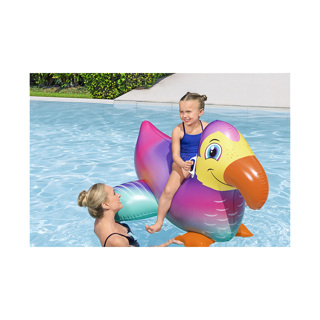 Поприветствуйте нового приятеля по бассейну – надувной плотик Bestway® Dandy Dodo™! Ярко окрашенный и готовый предложить вашему ребенку свою забавную мордочку, чтобы обнимать и цепляться, этот радужный пернатый приятель готов сопровождать вашего ребенка весь день под солнцем. Благодаря прочным ручкам ребенок может надежно держаться на плотике при катании по воде, а также переносить плотик к бассейну. Вашему ребенку понравится яркая индивидуальность и беззаботный вид птицы дронт. Плотик Bestway Dandy Dodo, который легко надувать, сдувать и хранить, станет восхитительным развлечением в течение многих сезонов!