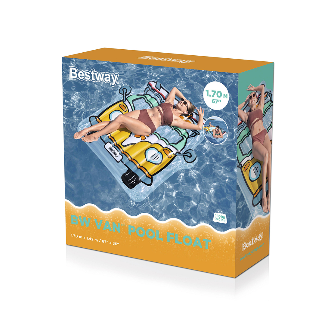 Настройтесь на веселое и прохладное лето с плотиком для бассейна Bestway® BW Van™. Этот плотик для бассейна размером 1,64 м x 1,27 м x 18 см (64 x 50 x 7 дюймов) имеет уникальную форму фургона серфера и принт с прозрачными окнами, он с комфортом вмещает одного взрослого общим весом до 100 кг (220 фунтов). Прочная конструкция с I-образными внутренними ребрами жесткости (I-beam) обеспечивает комфорт и поддержку во время плавания, а компактность BW Van позволяет положить его в сумку, отправляясь в бассейн или на пляж. После отдыха плотик можно легко сдуть и убрать на хранение до следующих теплых дней. Ваша семья будет в восторге от BW Van Float.