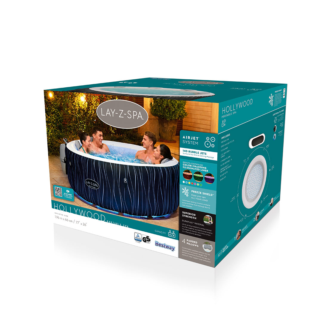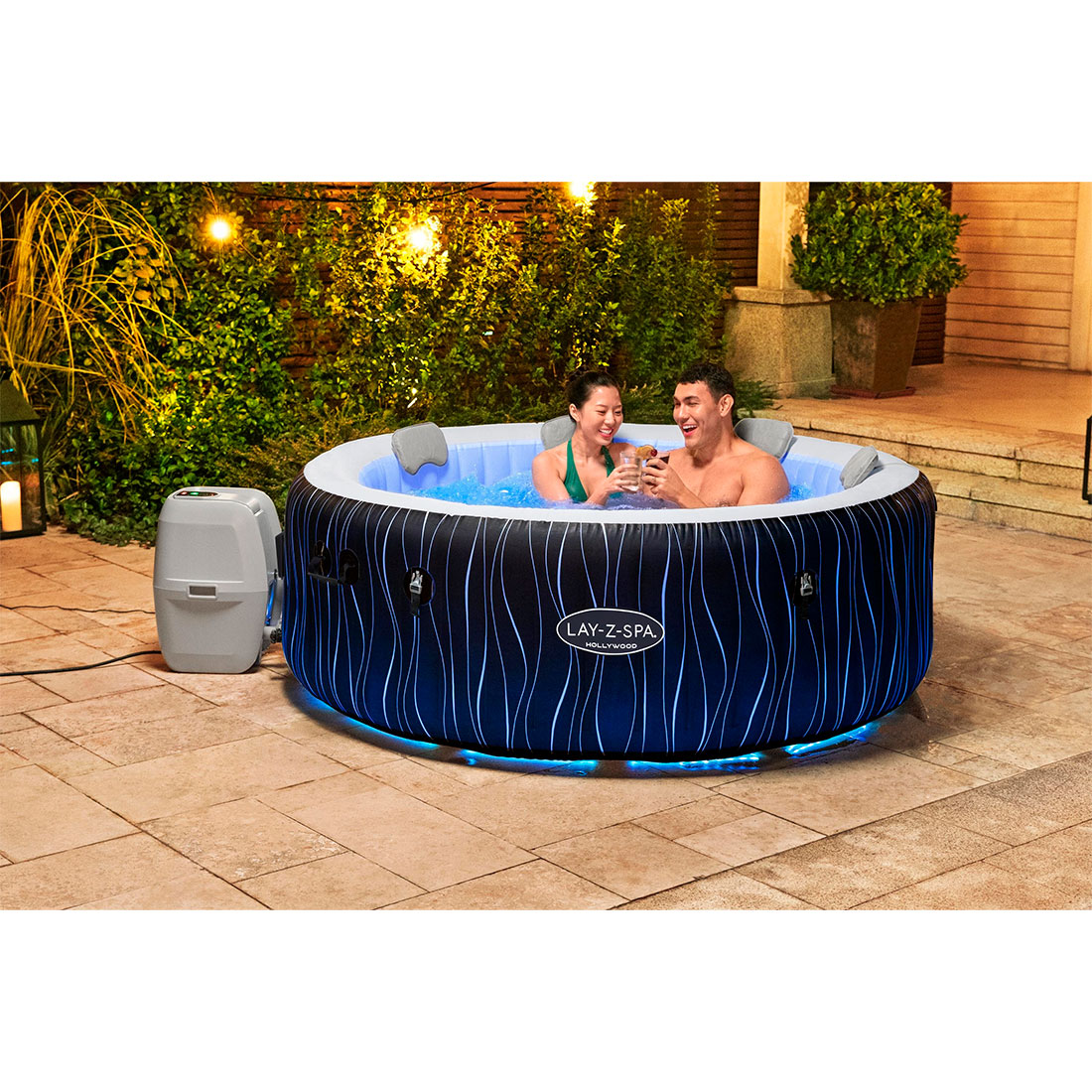 После долгого дня нет ничего более расслабляющего, чем погружение в теплую, пузырящуюся воду прямо на своем заднем дворе. Lay-Z-Spa® Hollywood AirJet™ обеспечивает эффект успокаивающего массажа для 6 человек; при этом установка его простая и быстрая. Температура воды в этом спа-бассейне доходит до 40°C (104°F) для максимального расслабления, которое обеспечивается расположенными по кругу 140 аэромассажными форсунками AirJet. Просто подсоедините насос и следите за тем, как он надувает бассейн. Hollywood AirJet предлагает уникальные инновационные спа-процедуры. Входящая в комплект светодиодная подсветка со сменой цвета дает расслабляющее свечение для создания особой атмосферы внутри спа-бассейна, в то время как полупрозрачный внешний лайнер создает захватывающий освещенный узор снаружи. Подключаемая подсветка может управляться пультом дистанционного управления для переключения между 7 различными цветами.
