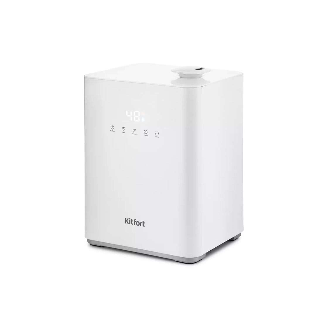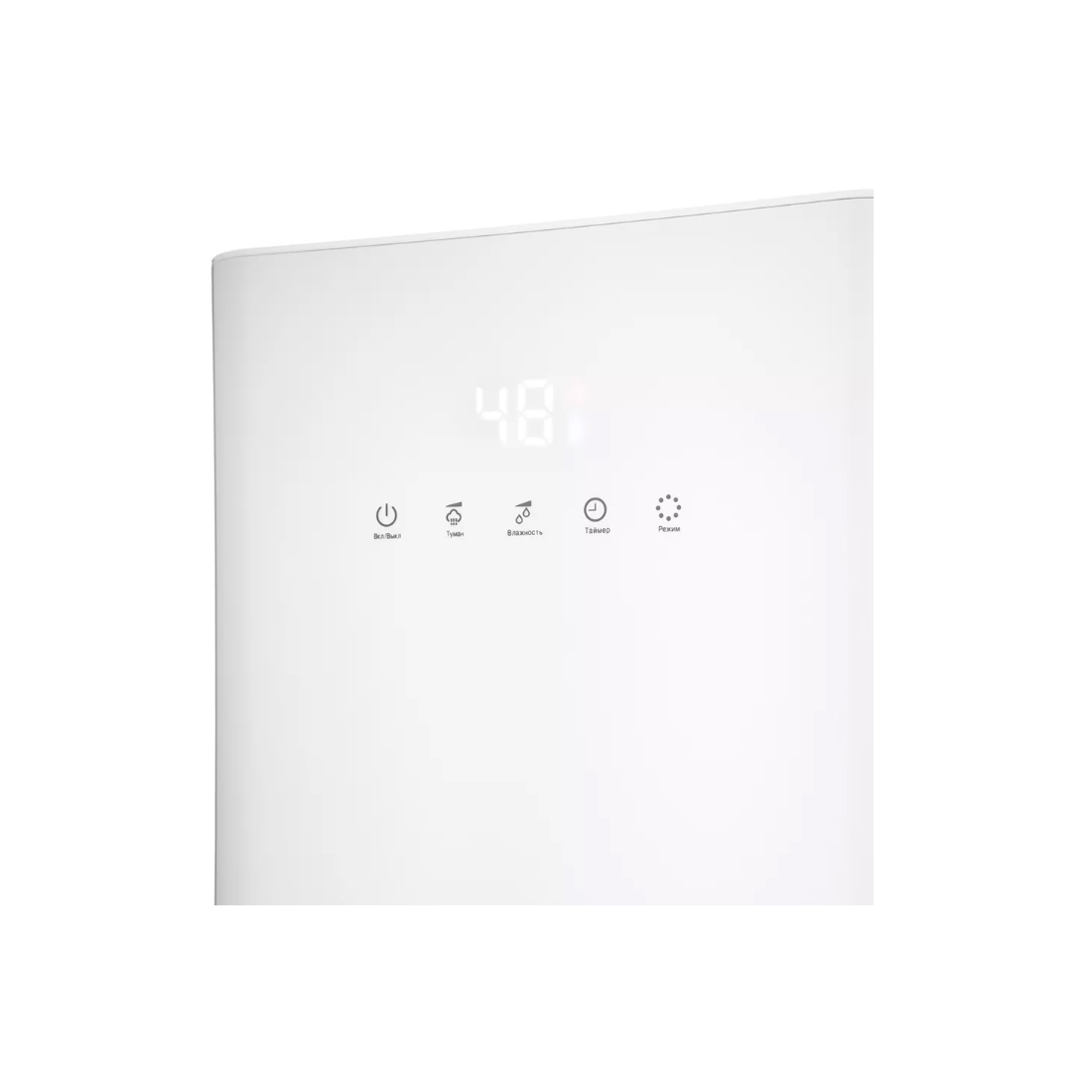 С помощью кнопок на передней панели можно установить целевую влажность воздуха 30–90 % с шагом 5, время таймера — от 1 до 12 часов и интенсивность тумана 1, 2 или 3.
