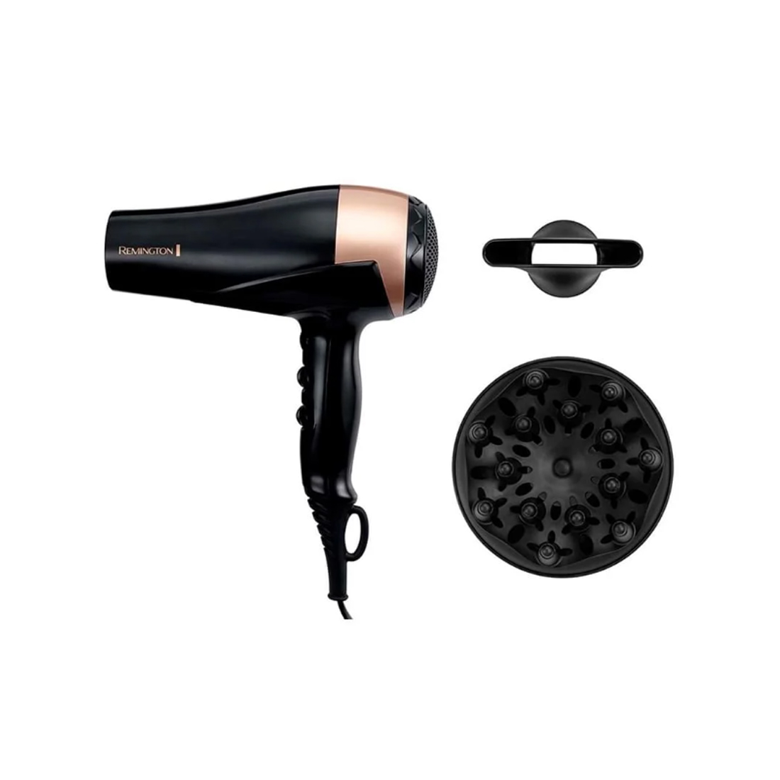 Фен Remington D5715 гарантирует мощность 2300 Вт с фактической мощностью мотора 2100 Вт и скорость воздушного потока 85 км/ч. Сохраняет при этом электроэнергию и имеет меньшее тепловое воздействие на волосы для их бережного стайлинга.