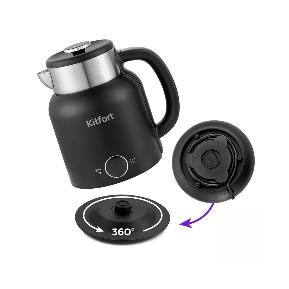 Чайник оснащен базой питания, позволяющей вращать его на 360 градусов и брать с любой стороны, что делает прибор более безопасным, а его эксплуатацию комфортной.