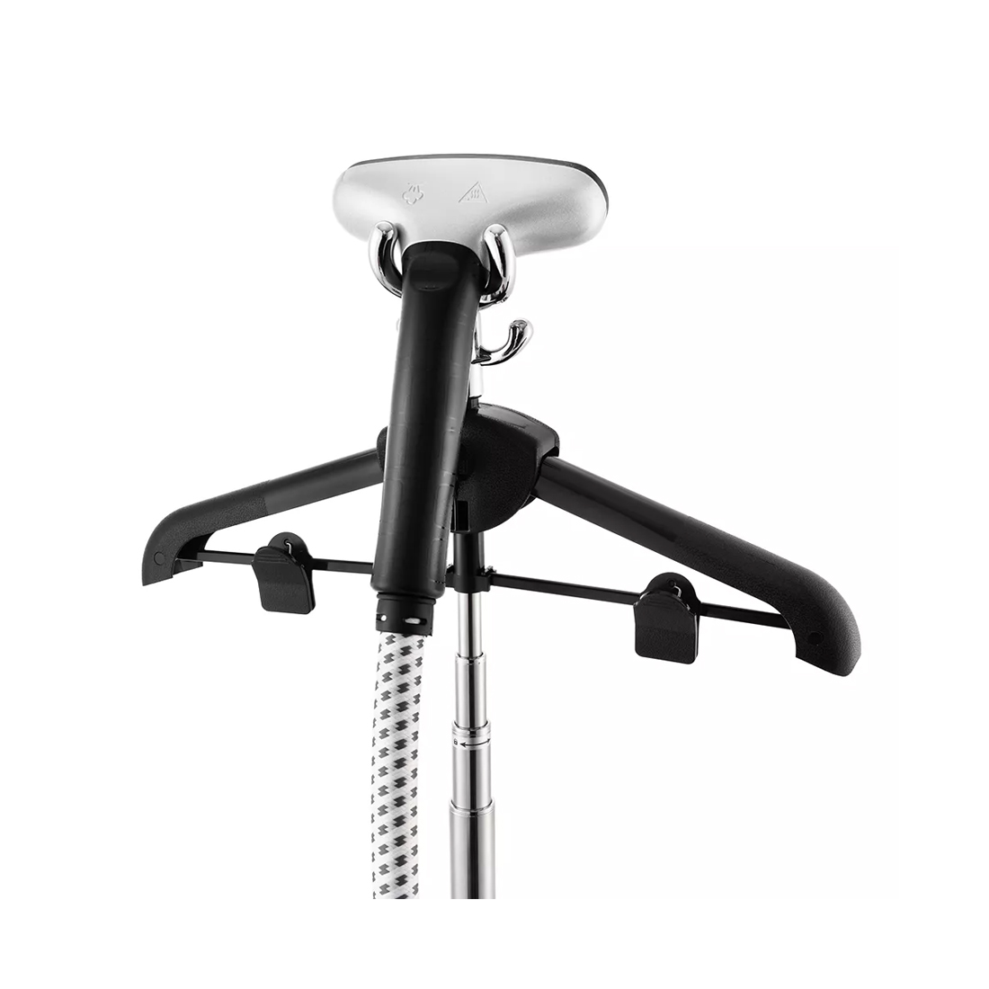 Во время отпаривания одежда может висеть на вешалке отпаривателя, установленной на телескопической стойке, на обычной вешалке, подвешенной к отпаривателю, просто на вешалке, на сушилке для белья. Шторы, например, можно гладить, не снимая их.
