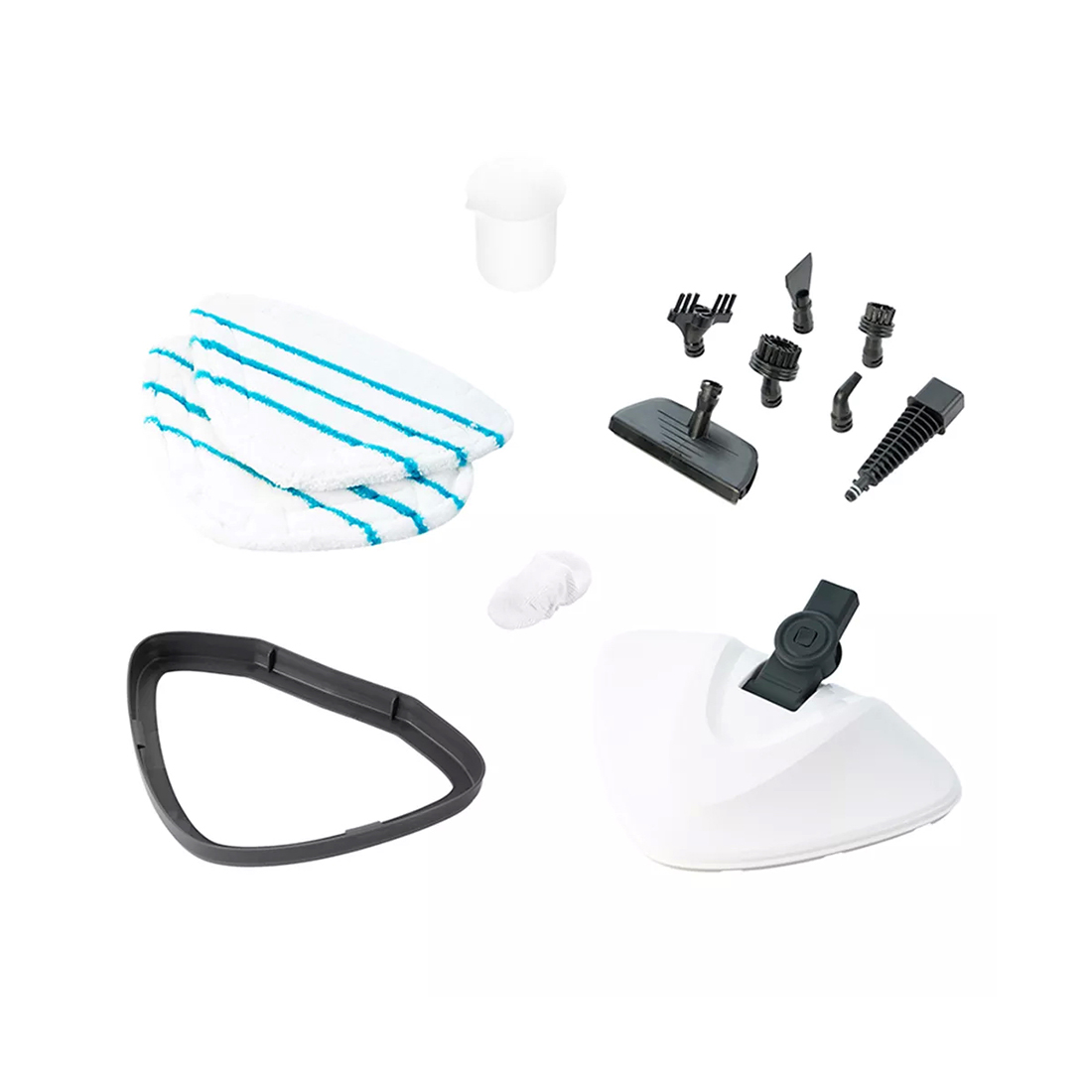 Kitfort KT-1008 имеет 10 насадок и съёмный ручной модуль, благодаря чему подходит для уборки: полов и стен, стеклянных поверхностей, тканевых вещей, сантехники для кухни и ванной, жалюзи и радиаторов отопления, варочных поверхностей и пр.