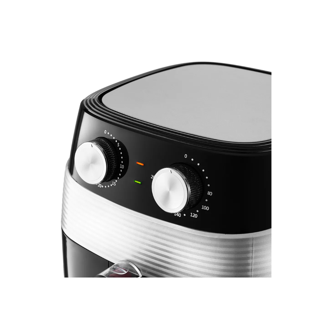 Таймер аэрогриля можно устанавливать до 30 мин. Температура регулируется от 80 до 200 °C. Таймер автоматически отключит прибор, когда установленное время закончится. Вы можете самостоятельно отключить аэрогриль. Также имеются индикаторы работы и работы.