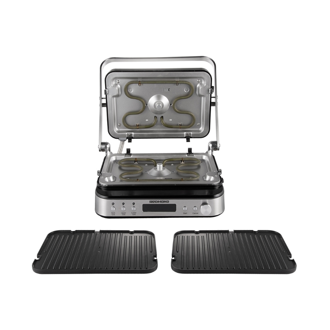 У прибора двусторонние панели: одна поверхность — ребристая для классических блюд гриль, другая — плоская для жарки яиц, сырников, котлет как на сковороде.