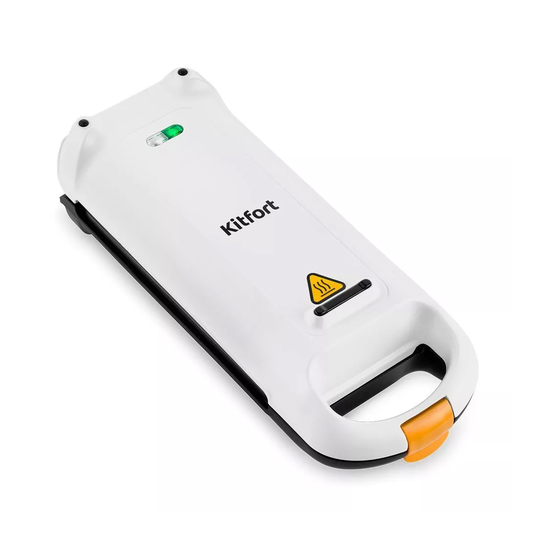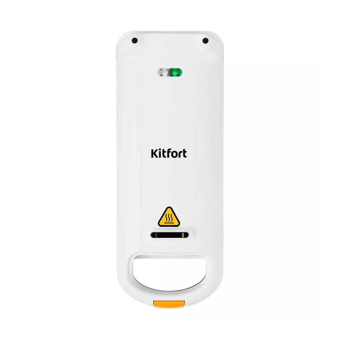 Корпус электрической вафельницы Kitfort КТ-1689 выполнен из термоустойчивого пластика. Сверху нанесена предупреждающая наклейка о высокой температуре во избежание ожогов.