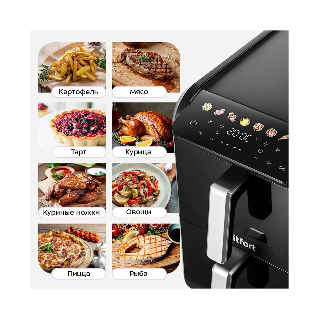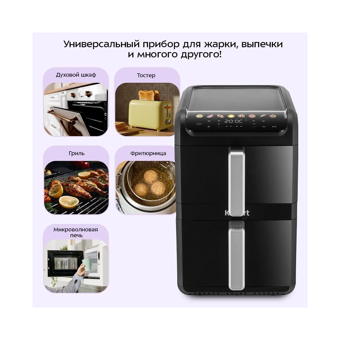 Главное преимущество этого аэрогриля заключается в том, что у него имеется два нагревателя (верхний и нижний) и два поддона разной емкости с решетками. Благодаря двум поддонам вы можете готовить два разных блюда одновременно, установив при этом для каждого свои настройки температуры и таймера. Благодаря функции синхронизации времени окончания приготовления вы можете приготовить основное блюдо и гарнир к одному времени и подать их к столу горячими.