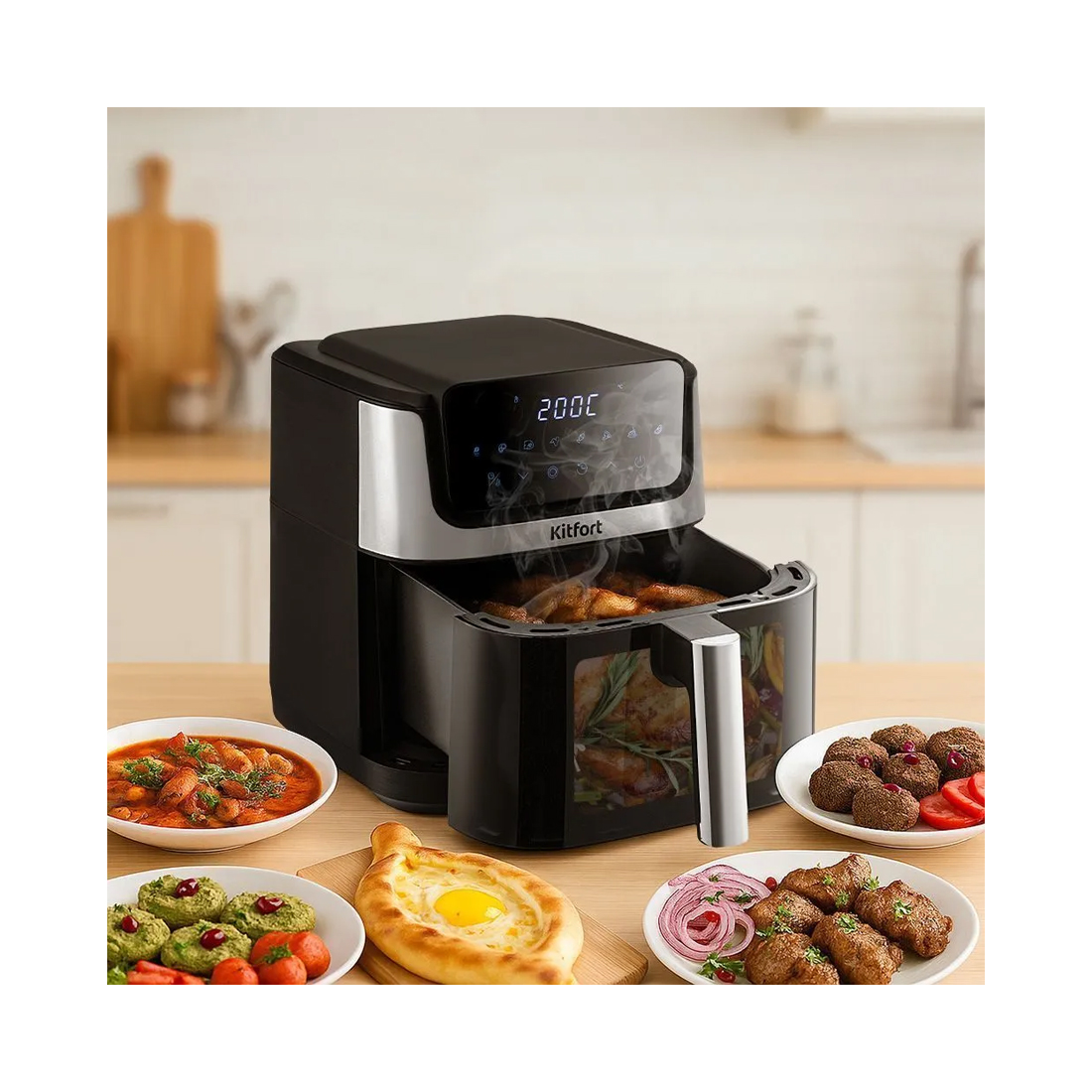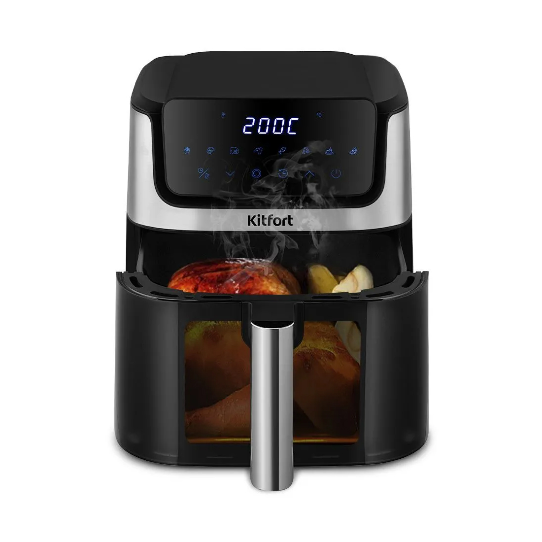 Для приготовления различных блюд необходима определённая температура и время готовки. Аэрогриль КТ-2284 сочетает в себе много функций – с ним вы можете установить температуру приготовления от 80 до 200 °C и время приготовления до 60 минут.