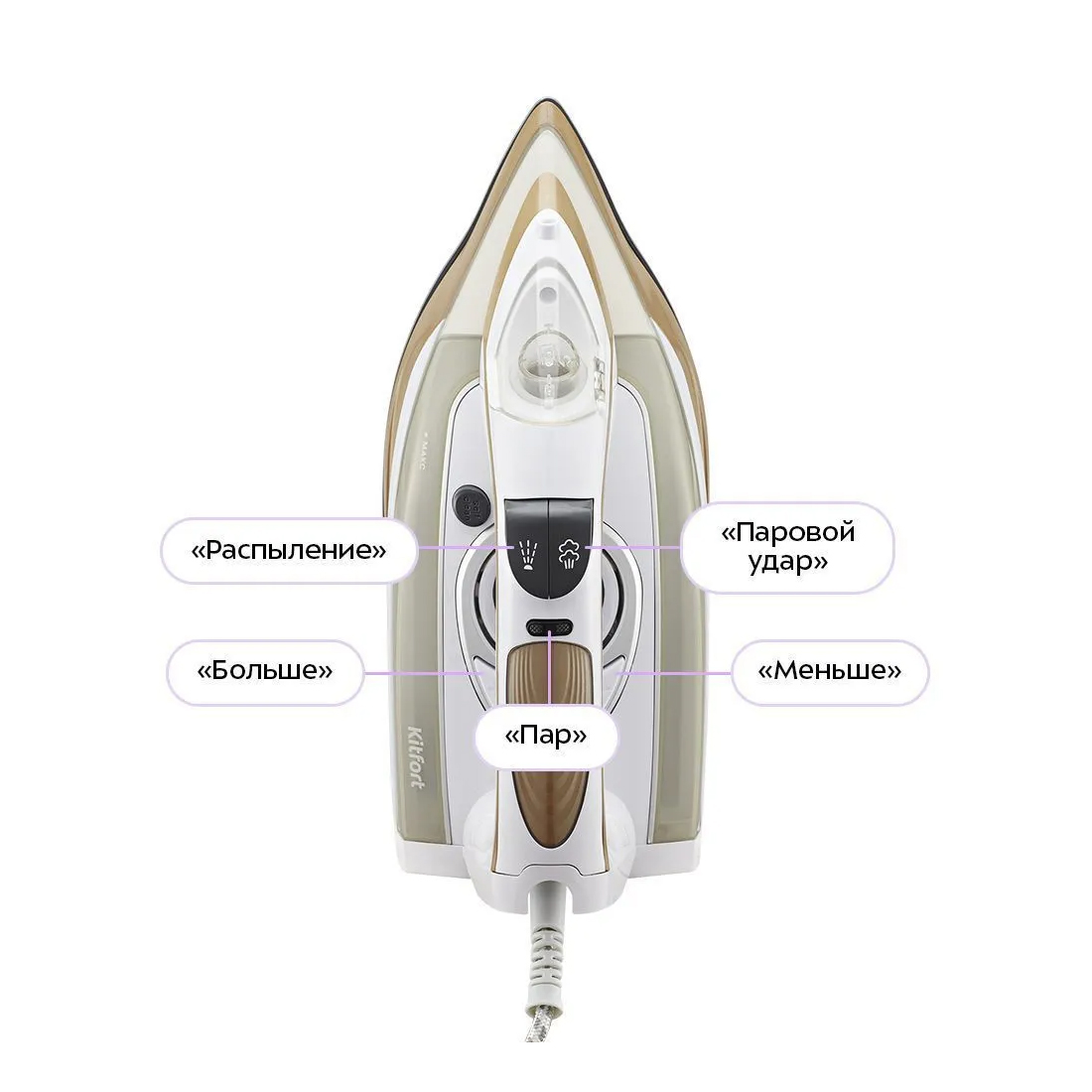 Управление утюгом интуитивное: две кнопки «Больше» и «Меньше» для включения, регулировки уровня нагрева и отключения. Отдельные кнопки «Пар» и «Паровой удар» отвечают за постоянную подачу пара и функцию усиленного удара.