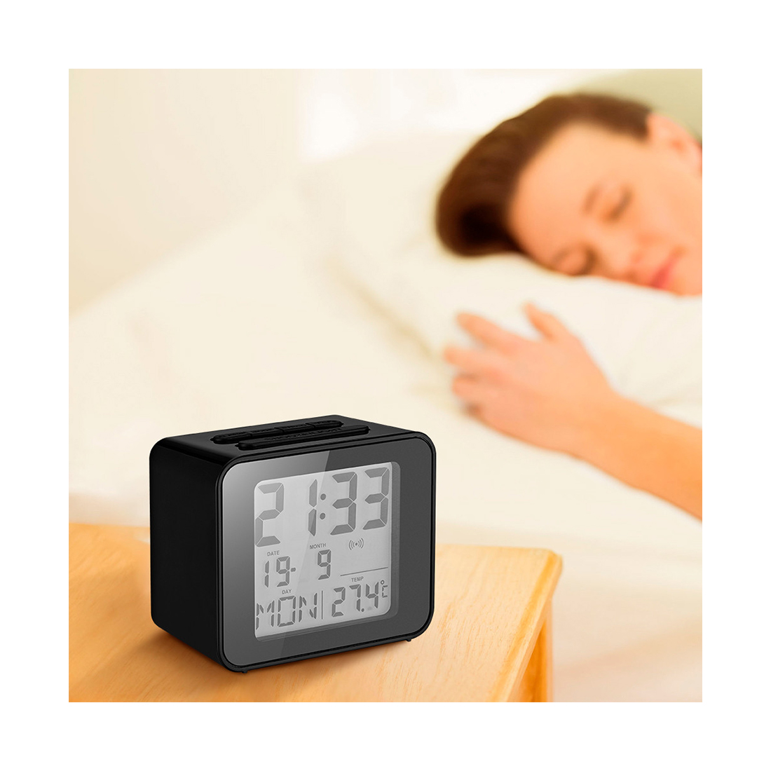 Кнопка «Alarm» используется для настройки будильника. Кнопка «Mode» включает настройки часового пояса, времени, даты и языка. Кнопками «+» и «−» настраивают время, будильник, дату, единицы измерения температуры, 12-часовой или 24-часовой формат времени.