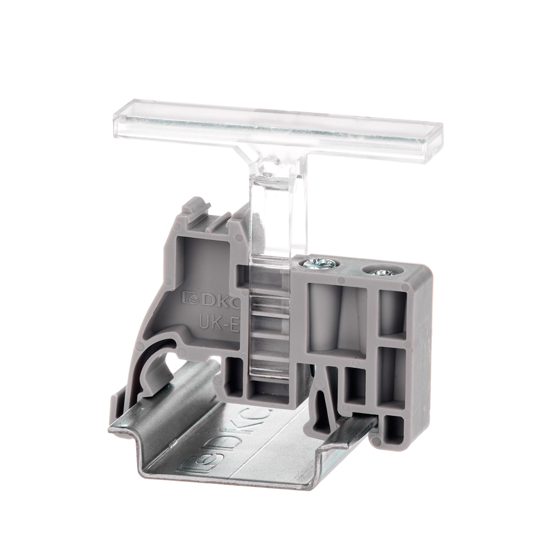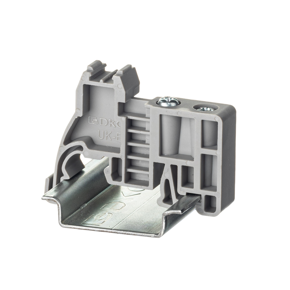 Торцевой фиксатор с винтовым зажимом из полиамида серого цвета толщиной 9,5 мм на рейку OMEGA 35 мм предназначен для фиксации и разделения клемм на рейке.