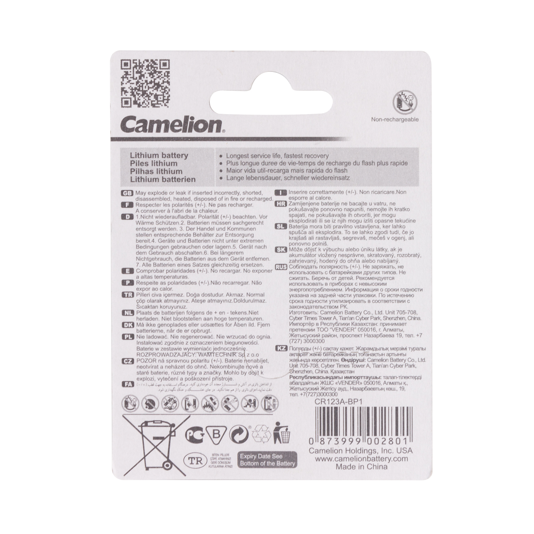 Батарейки CR123A-BP1 работают в широком диапазоне температур (от -30 до +65 C). Идеально подходят для камер, фонариков, радиоплееров, автоматических сенсорных кранов и т. д. С батарейками CAMELION цифровое устройство проработает долго и не подведёт внезапно в самый ответственный момент.