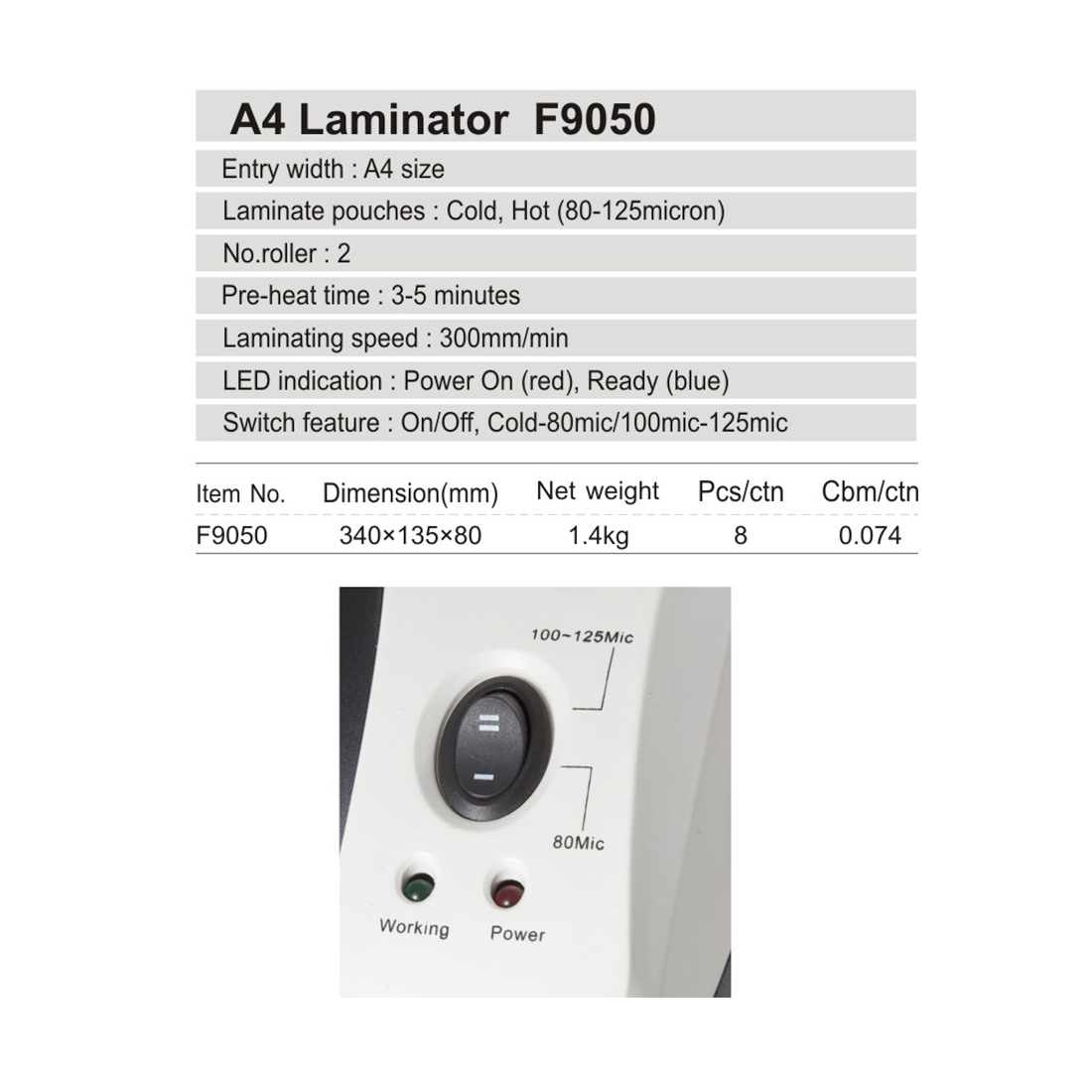 Корпус ламинатора не перегревается и безопасен при прикосновении. Ламинатор Comix F9050 позволяет надежно заламинировать документы, презентационные и рекламные материалы, фотографии, грамоты, рисунки, открытки, визитки, инструкции и многое другое.