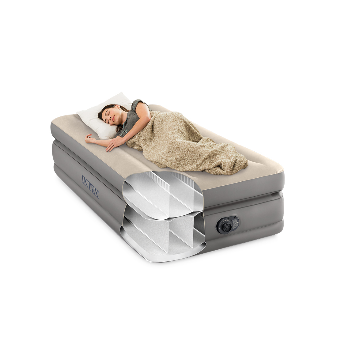 Надувная кровать серии Dura Beam изготовлена по технологии Fiber-Tech. Внутренние перегородки сделаны из множества полиэфирных волокон, за счет чего кровать становится намного прочнее и легче. Благодаря новой технологии практически исключен разрыв внутренних перегородок, кровать стала устойчивой и стабильной даже при одновременном размещении нескольких человек, значительно выросла надежность и долговечность изделия. Флокированное покрытие кровати не даёт соскальзывать белью, и в тоже время легко чистится. Встроенный электронасос позволяет быстро надувать и сдувать кровать и дает возможность отрегулировать ее упругость. При отсутствии электричества, кровать можно накачать механическим насосом. Для этого в центре клапана расположено отверстие для подключения механического насоса. В комплект входит сумка для переноски кровати и самоклеющаяся заплатка. Клапан 2-в-1.