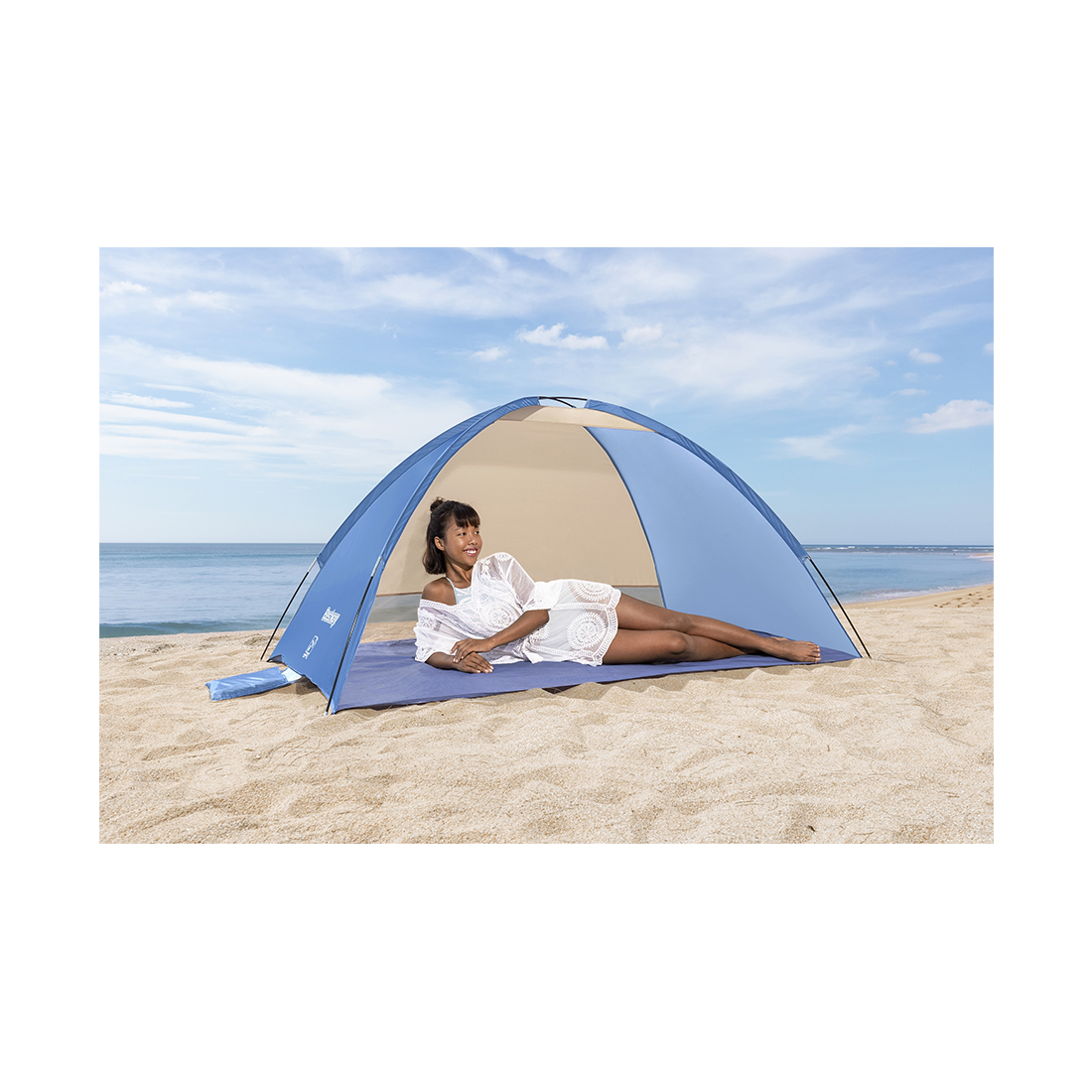 Взять палатку на пляж - значит, обустроить там персональный уголок комфорта и прохлады, где можно отдохнуть в обнимку с увлекательным романом, подремать в полуденный зной или перекусить после активного заплыва. Дизайн в ярком салатовом оттенке сделает ее заметным маячком на берегу водоема. В разобранном виде палатка от солнца занимает совсем немного места, благодаря простоте конструкции ее легко и быстро устанавливать. Не откажите себе в удовольствии потягивать прохладительный напиток в тени, под навесом, - от летних деньков нужно брать по максимуму.